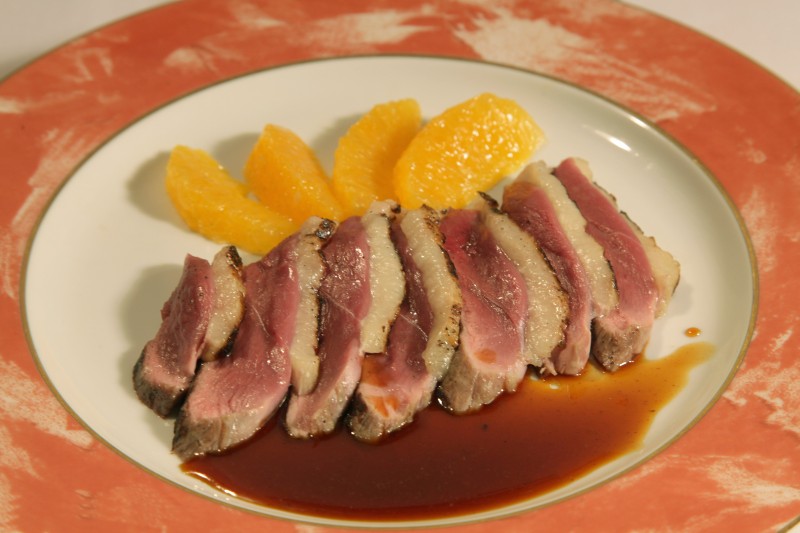 4. To Serve: slice each breast into thin diagonal layers and place one breast on each of the warm garnished plates. Pour the orange sauce around the breast slices and serve.
